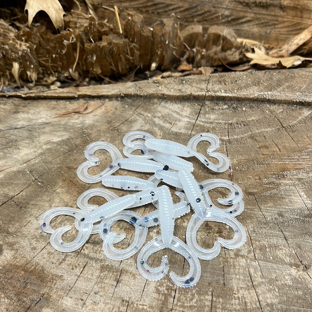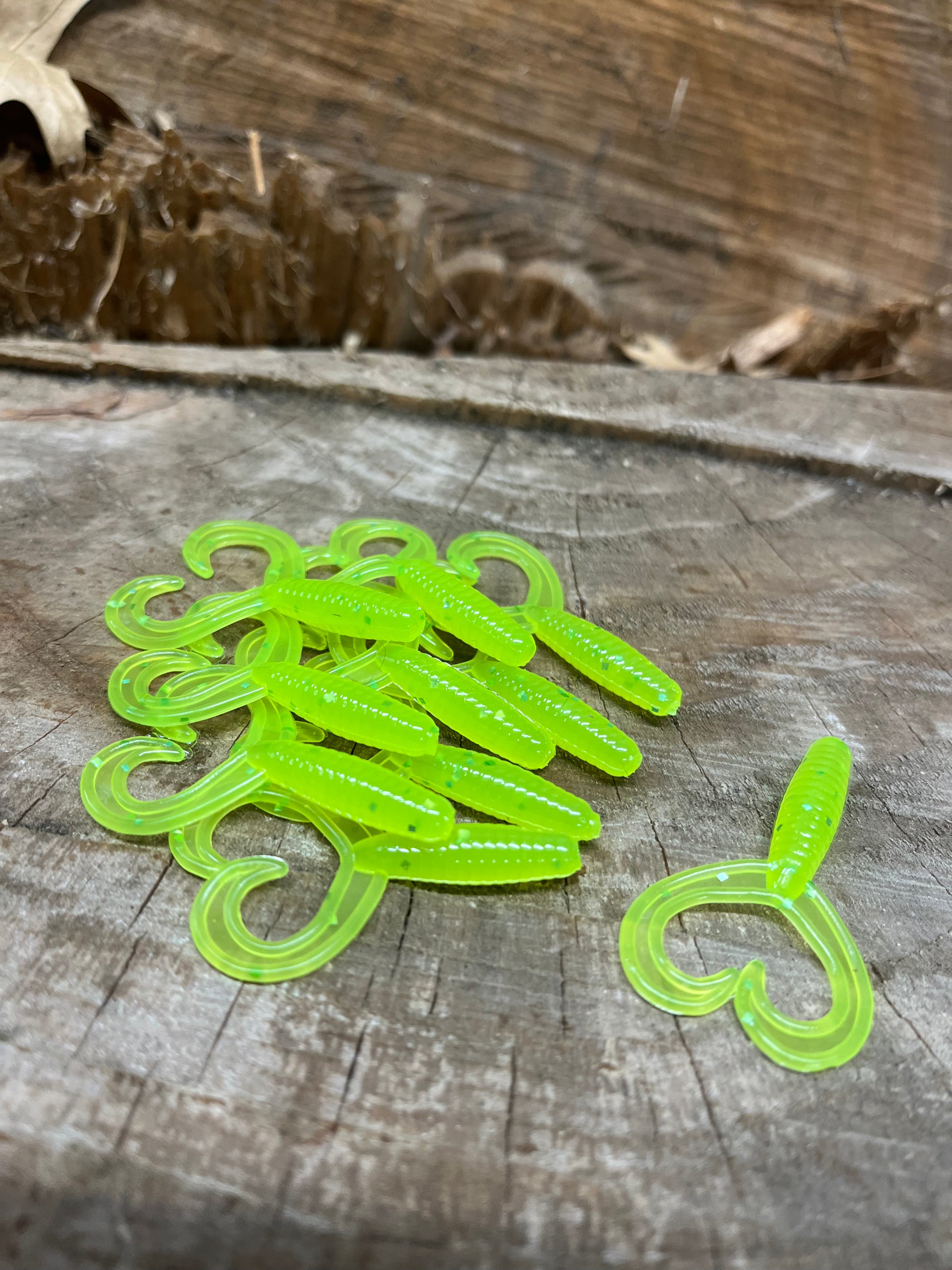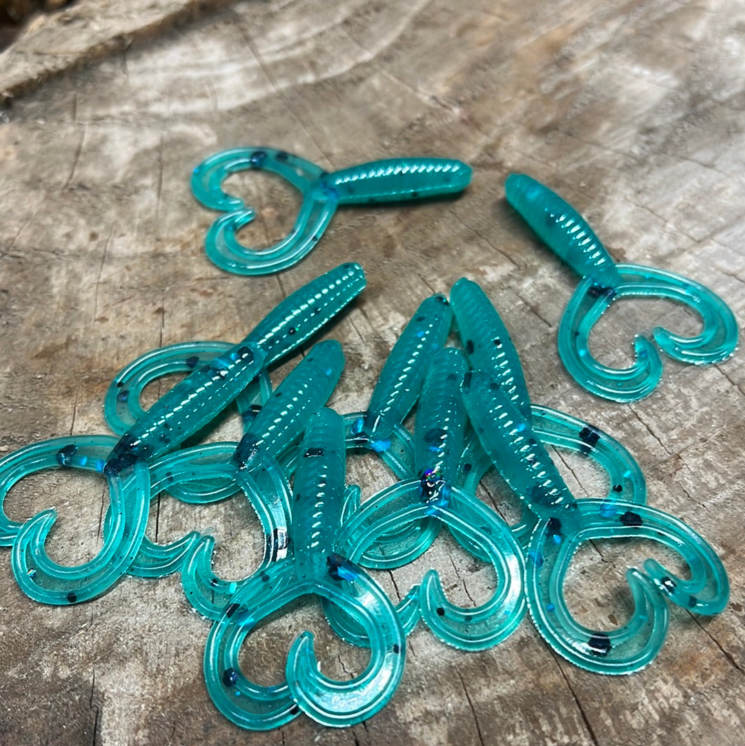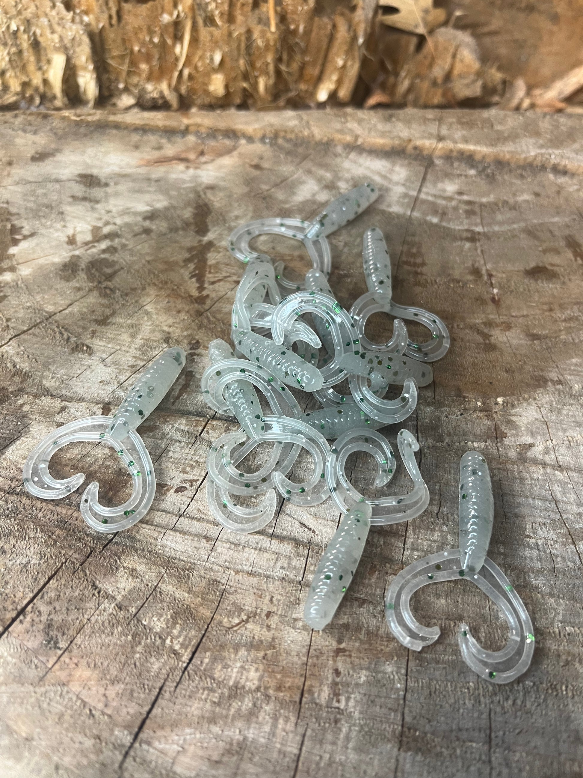 Twin Tails are our double-tailed grub with a ribbed body to create additional vibration, while its twin tails pulsate and trigger strikes great on a jighead. 1.75 inch in length great for the dip next to brush to get them slabs out.